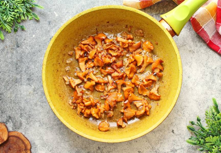 Обжаривайте лисички на среднем огне, пока вода не испариться, а грибы немного обжарятся. На это уйдет примерно 10-15 минут.