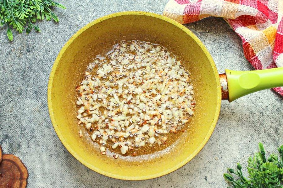 Репчатый лук почистите, сполосните и мелко порежьте. В сковороду выложите сливочное масло и растопите на среднем огне. Выложите лук и обжарьте в течение 5-6 мину, лук должен стать мягким.