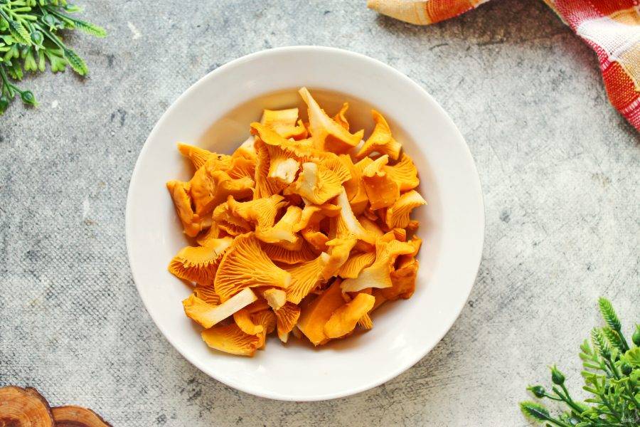 Лисички переберите, отрежьте места загрязнения и корни, сполосните и дайте воде полностью стечь. Порежьте грибы на дольки.