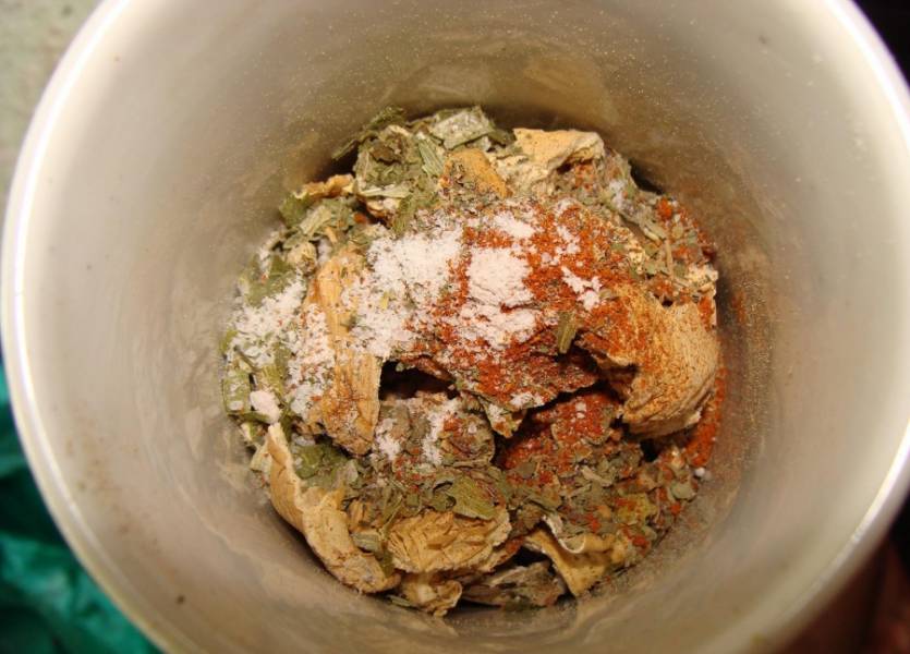 Добавляем специи. Я использую красный и черный молотые перцы, сушенный базилик. Можно добавить еще чего-то, на ваш вкус. Добавляем соль.