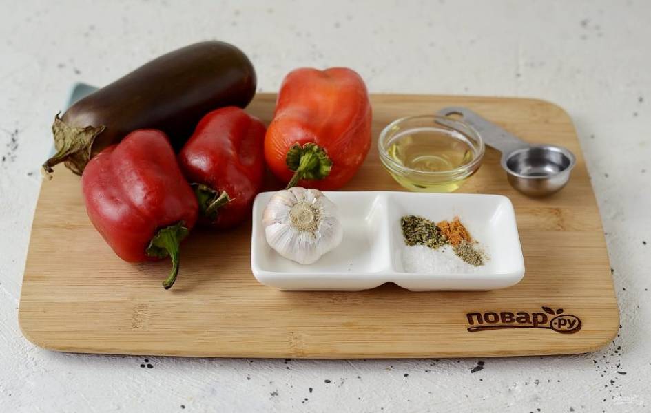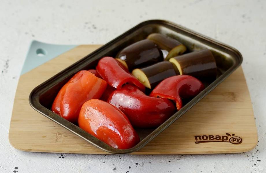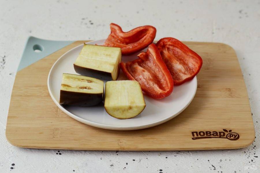 Болгарский перец разрежьте пополам, удалите семена и хвостик. Баклажан разрежьте пополам, затем на 1-2 части.