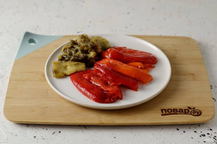 Переложите горячие овощи в пластиковый контейнер или пакет на 10 минут, затем очистите от кожицы перцы и баклажан.