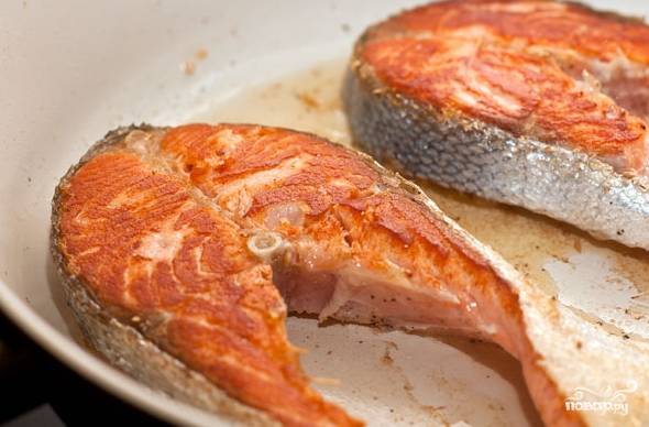 3. Разрезанную на стейки семгу необходимо посыпать перцем и солью и поджарить. Сковорода должна быть сухой. В процессе жарки обращайте внимание на корочку семги, она должна получиться красивой и румяной. Постарайтесь рыбу не пересушить.