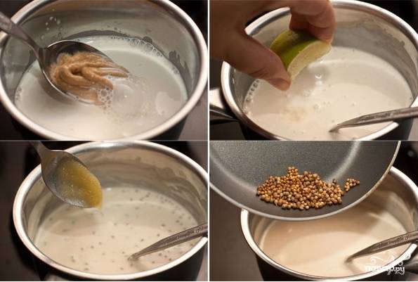 1. Прежде чем разбираться, как приготовить соус к жареной семге, необходимо уточнить, что подливка может быть подана к блюду сразу же, как приготовлена. Допускается хранение её в холодном месте несколько дней. Возьмите сотейник, налейте в него необходимое количество сливок. Не ставьте на большой огонь. К сливкам насыпьте горчицу, мед. Добавьте свежевыжатый сок лайма. Полученную жидкость нужно размешать. На отдельной сковороде нагрейте зерна горчицы и кориандра, чтобы полностью раскрыть их аромат. Все составляющие соедините в соусе.