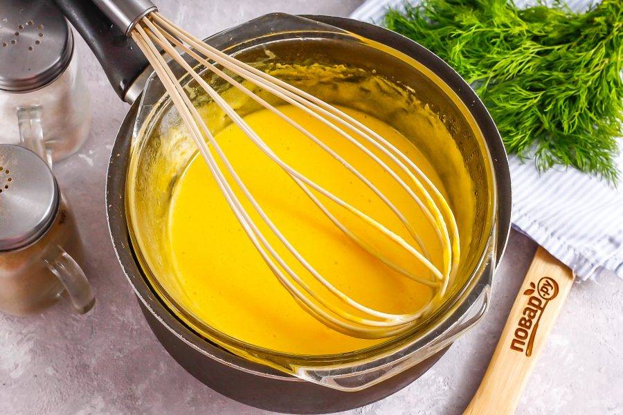 Таким образом вмешайте в соус все масло, но не сразу, иначе он расслоится. Здесь важно терпение! Затем снимите емкость с водяной бани, выключите нагрев.