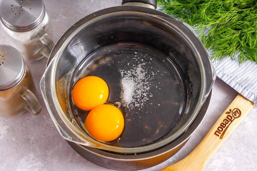 Отделите желтки от белков и переместите в глубокую емкость, которую вложите в другую емкость с кипящей водой, получая водяную баню. Белки используйте в другом рецепте. Всыпьте к желткам соль и молотый черный перец.