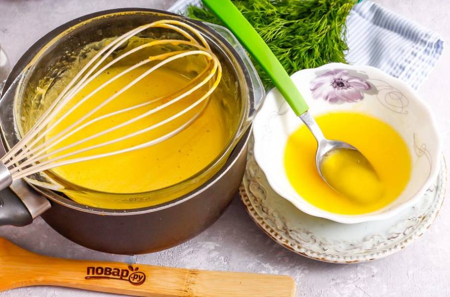 Не прекращая взбивать желтковую массу, чтобы она не сварилась на водяной бане, вливайте по 1 ст.л. топленое сливочное масло.