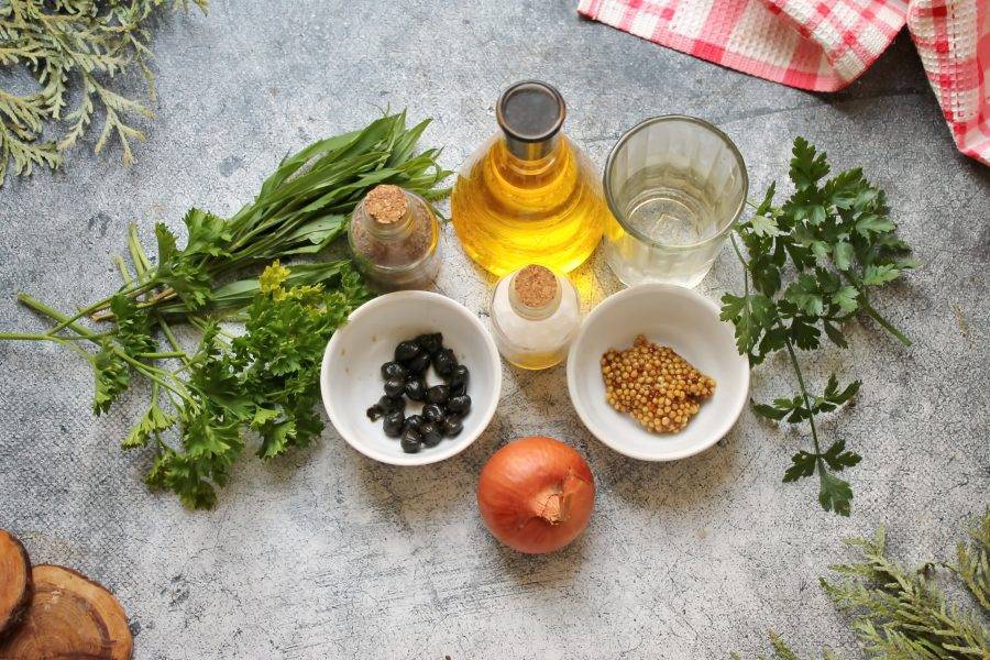 Подготовьте все необходимые ингредиенты для приготовления соуса "Равигот". Зелень вымойте и обсушите, каперсы откиньте на сито и дайте жидкости стечь.