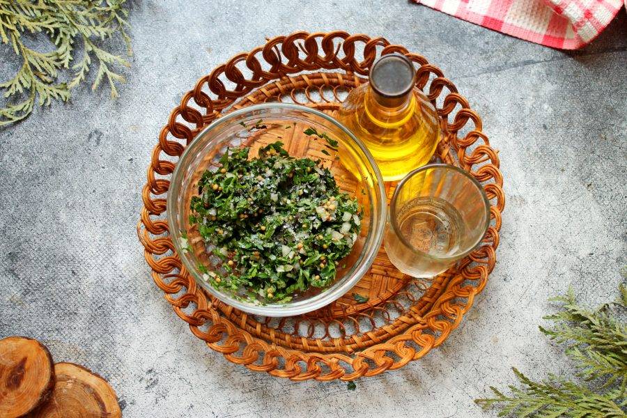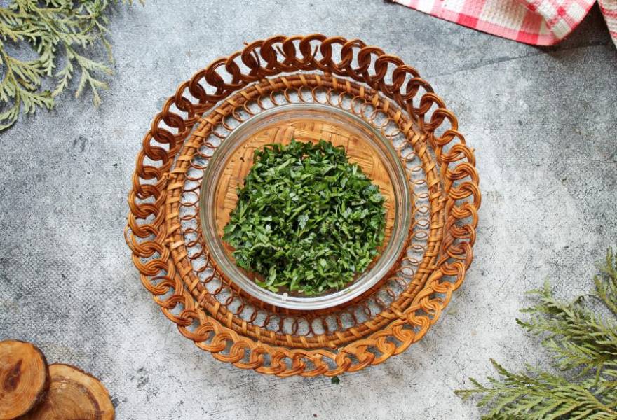 Петрушку, эстрагон и кервель очистите от веточек и мелко порежьте. Добавьте в миску.