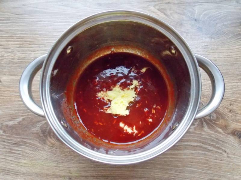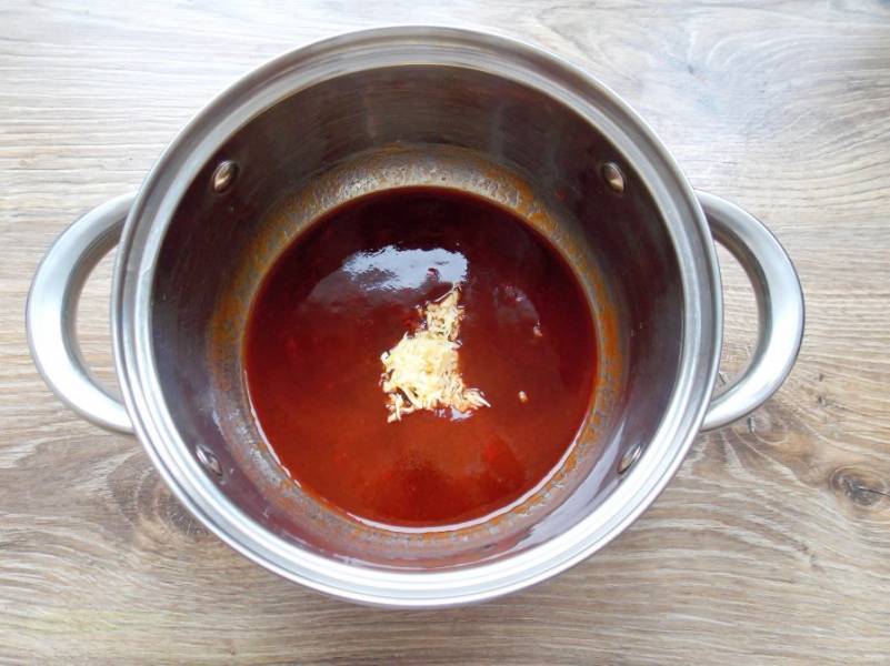 Очистите чеснок и натрите на мелкой терке. Добавьте в кастрюлю с томатно-соевой смесью.