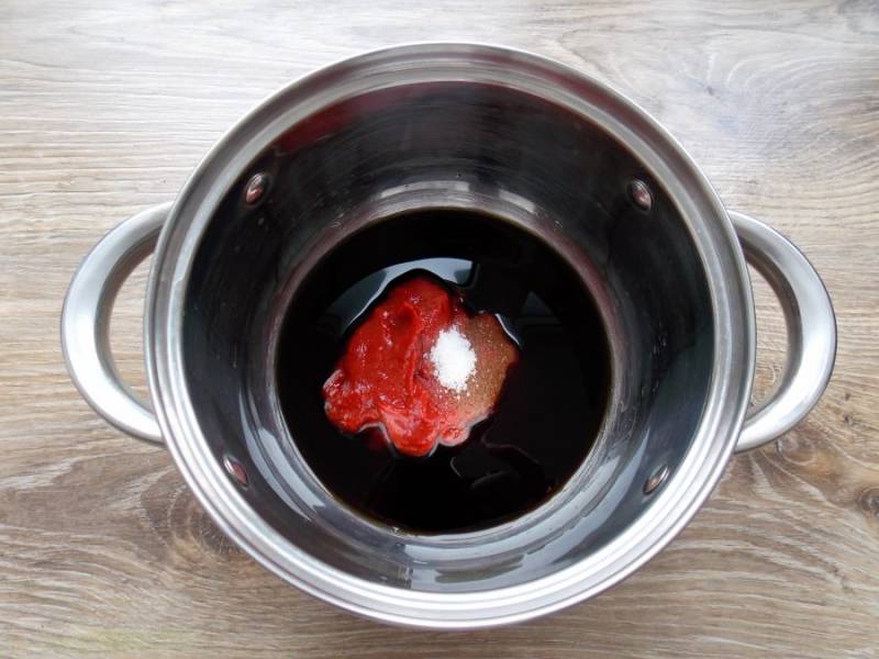 В кастрюлю вливаем соевый соус, саке, добавляем томатную пасту. Всыпаем сахар и перемешиваем до однородного состояния.