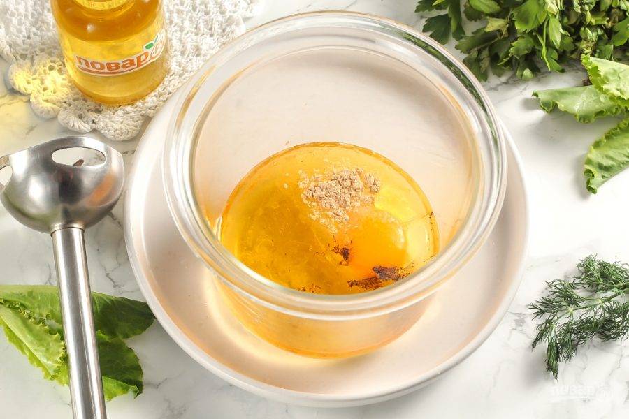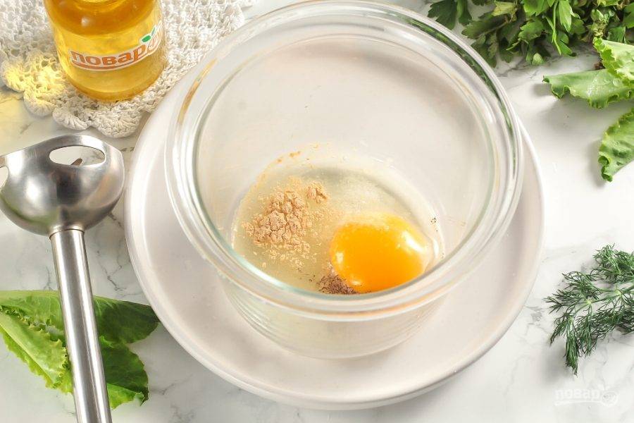 В глубокую емкость для погружного блендера вбейте куриное яйцо. Всыпьте соль, молотый черный перец, сухую горчицу и влейте лимонный сок.