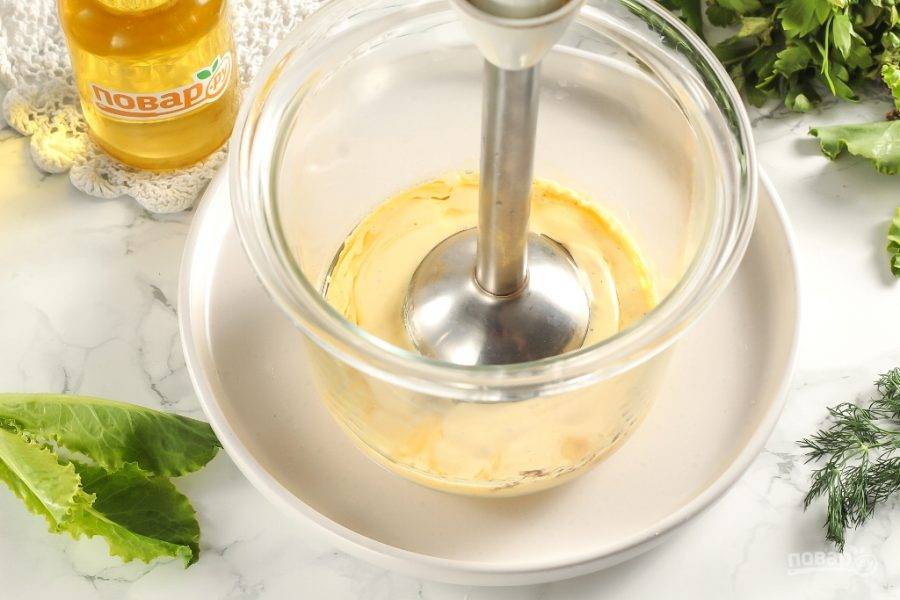 Поместите чашу блендера прямо на желток и начните измельчать, не отрывая блендер от дна. Вам понадобится примерно 1 минута, чтобы соус начал густеть. Как только это произойдет, слегка приподнимите венчик и дальше взбивайте.