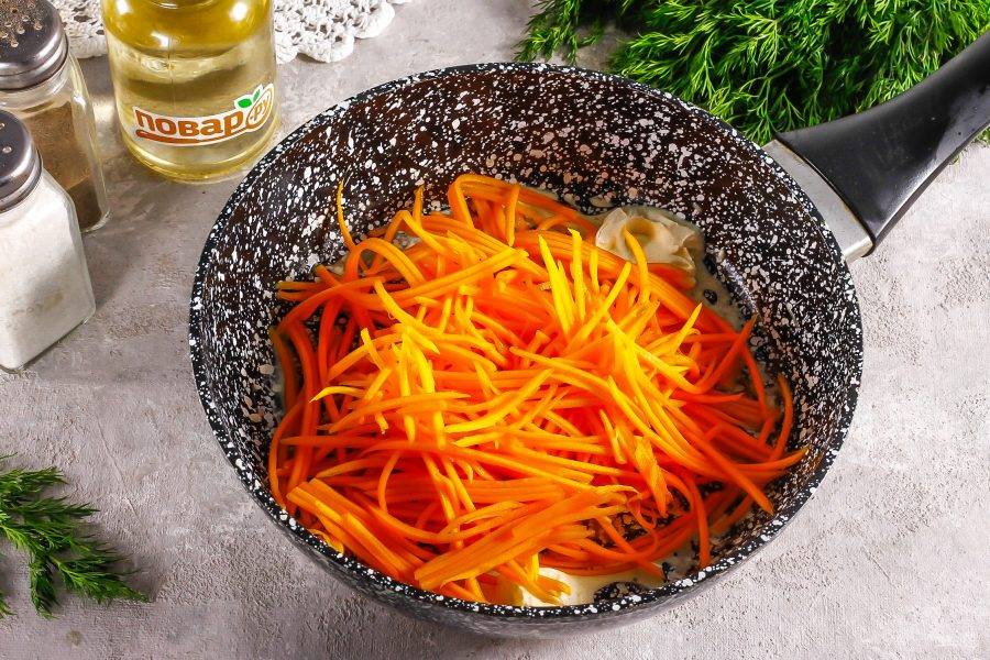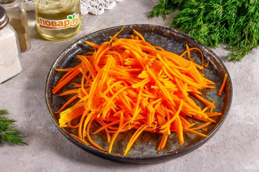 Разрежьте тыкву пополам, удалите семена и волокна внутри. Срежьте кожуру и промойте части плода в воде, обсушите бумажными салфетками. Натрите на терке для моркови по-корейски.