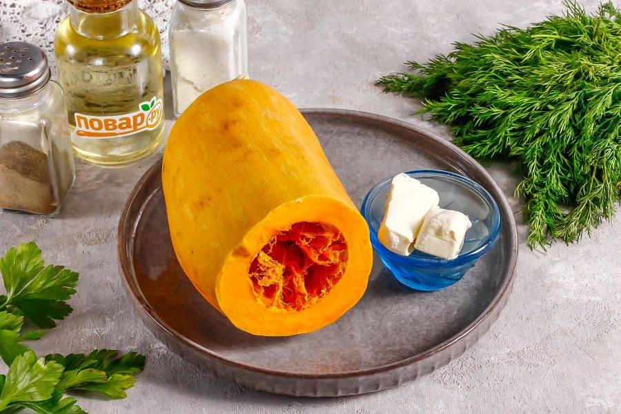 Подготовьте указанные ингредиенты. Тыкву выберите продолговатую, чтобы нарезка получилась длинной, а не короткой.