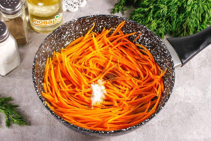 Посолите и поперчите, сразу же перемешайте. Томите все на умеренном нагреве примерно 3-4 минуты до мягкости тыквенной нарезки. Главное — она не должна потерять форму и превратиться в пюре.