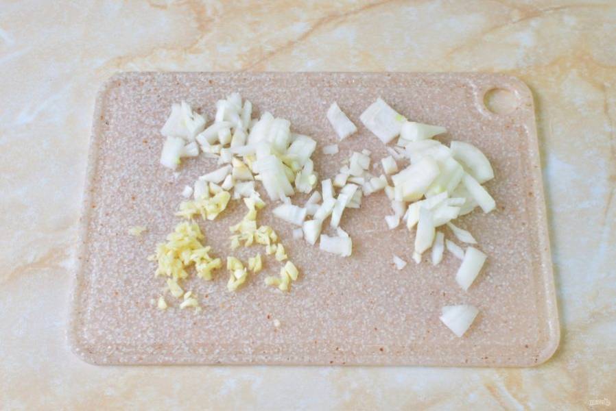 Лук очистите от шелухи, ополосните в холодной воде и мелко нарежьте.