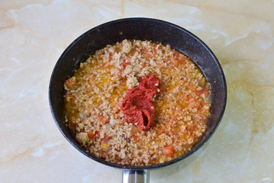 Добавьте его в сковороду к фаршу. Обжарьте еще 2-3 минуты, чтобы помидор пустил сок.