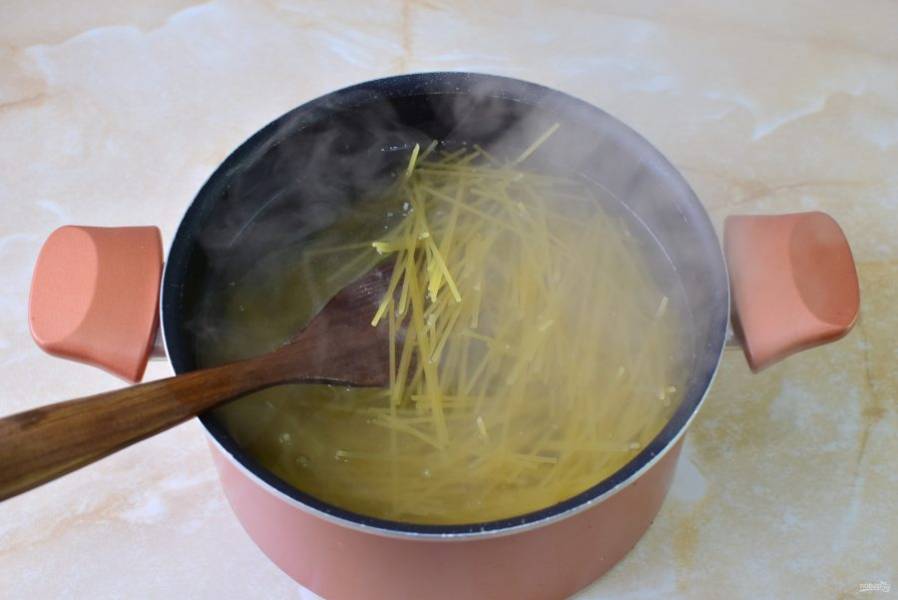 Одновременно поставьте вариться спагетти. Опустите их в кипящую подсоленную воду. Варите до мягкости 12-15 минут.