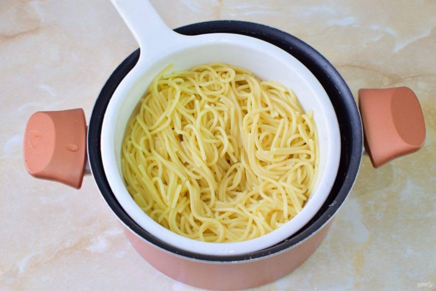 К этому времени уже будут готовы спагетти. Откиньте их на дуршлаг и пролейте холодной водой.