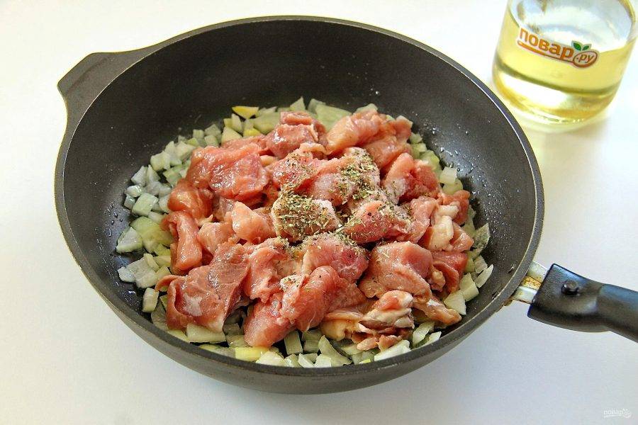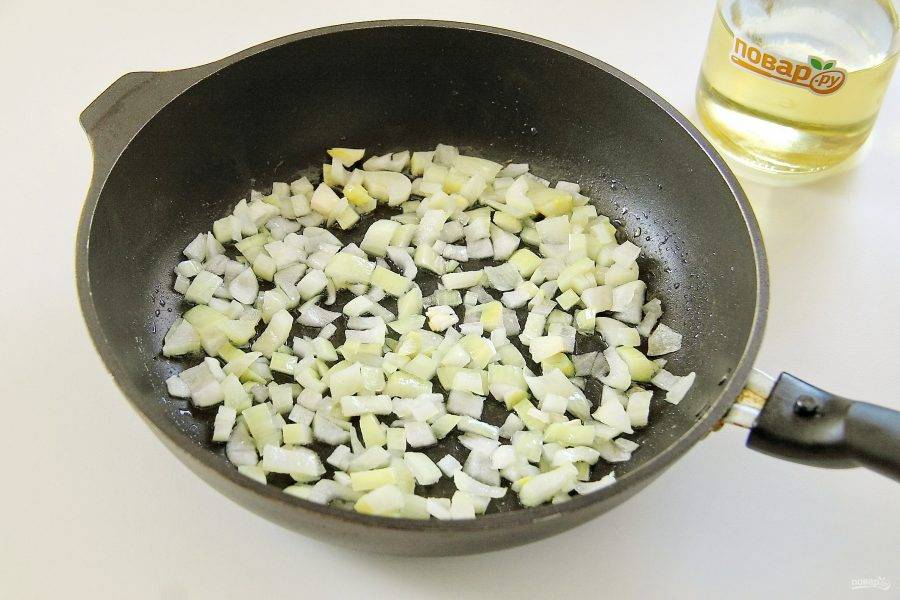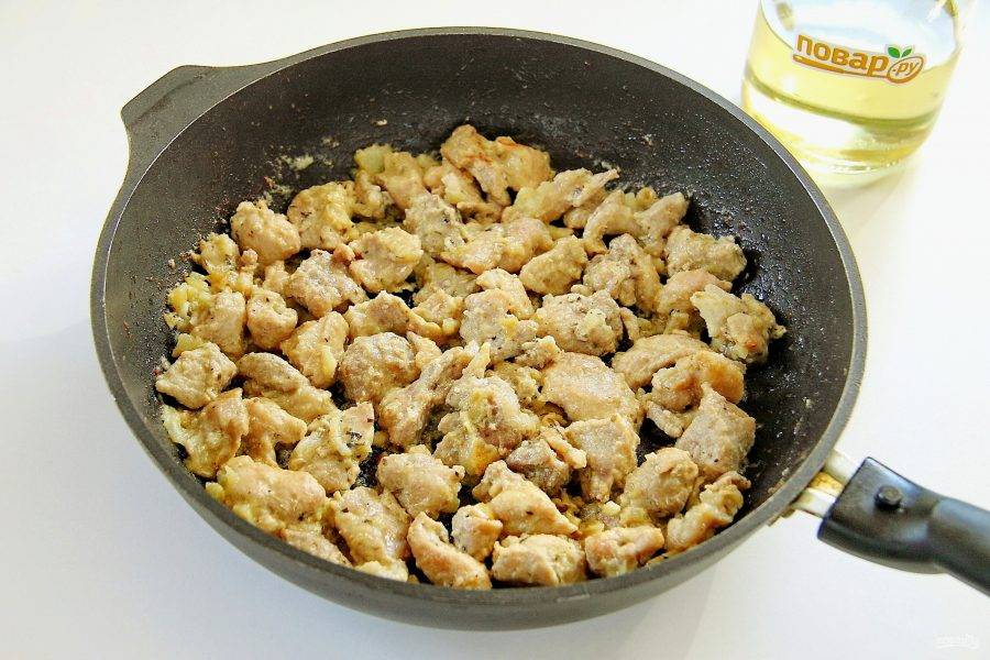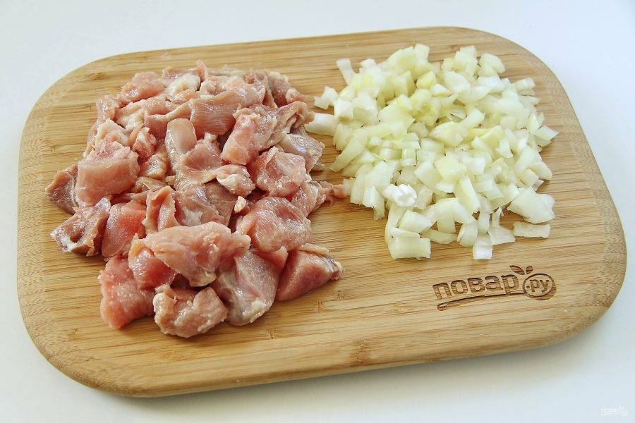 Филе нарежьте небольшими кусочками, лук нарежьте кубиками.