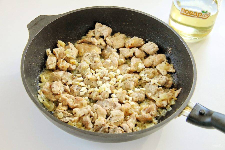 Готовьте периодически помешивая на среднем огне до полной готовности мяса. В самом конце добавьте измельченный ножом чеснок.