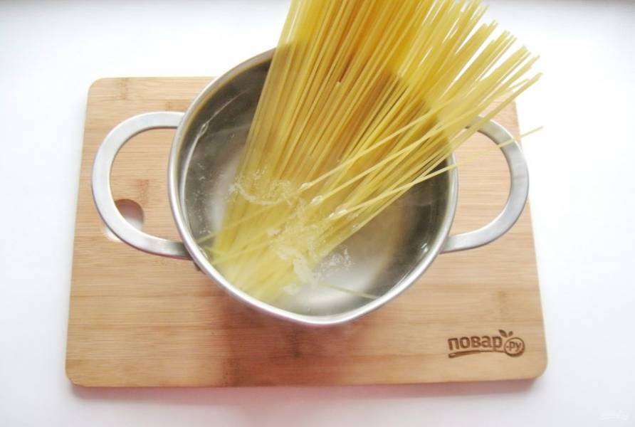 Вскипятите в кастрюле воду, посолите и выложите спагетти. По мере того, как спагетти будут становиться мягче, заворачивайте их по кругу и опускайте в кастрюлю.