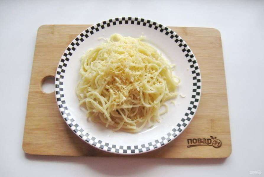 Выложите спагетти на тарелку. Посыпьте тертым сыром.