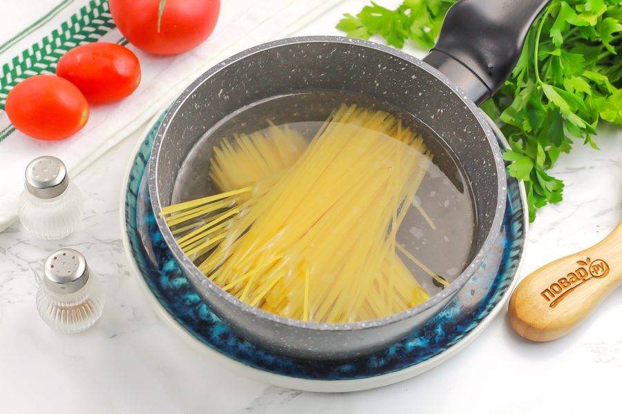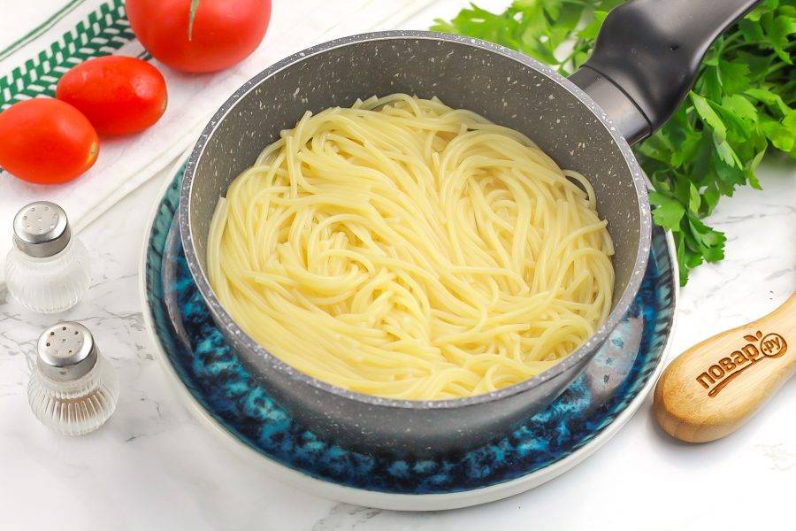 Доведите до кипения и убавьте нагрев до умеренного. Отварите спагетти примерно 5-10 минут. Точное время варки указано на пачке.