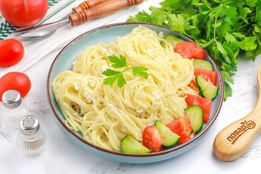 Выложите горячие спагетти с творогом на тарелки и подайте к столу с соусами, свежими овощами, сыром и т.д. Приятного вам аппетита!