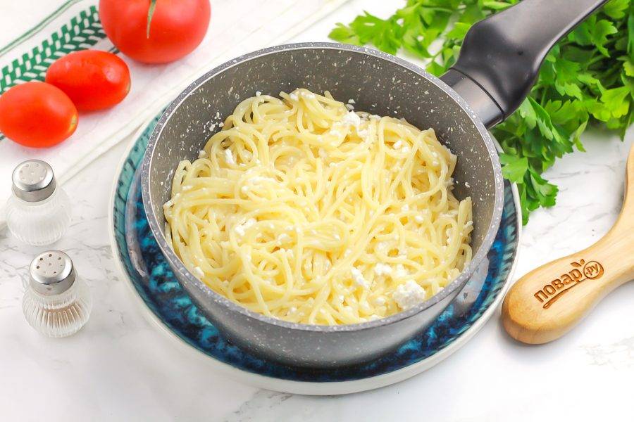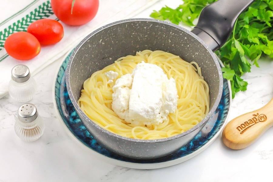 Слейте жидкость из емкости со спагетти или выложите их на дуршлаг. Затем добавьте жирный творог. Если решили добавить и сливочное масло, то сделайте это на данном этапе.