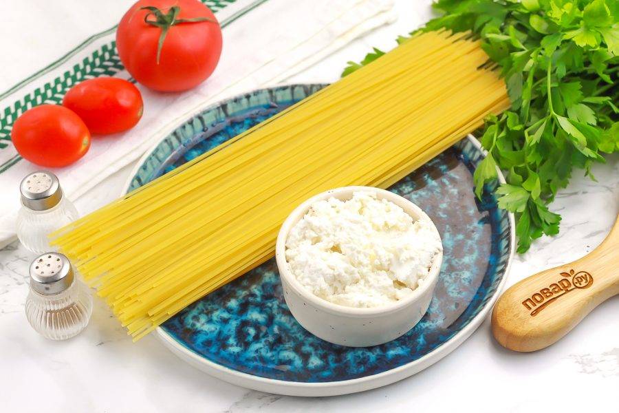 Подготовьте указанные продукты. Спагетти выбирайте той толщины, которая вам по вкусу. Творог лучше всего приобрести жирный. Если он низкой жирности, то дополнительно добавьте 20 грамм сливочного масла.