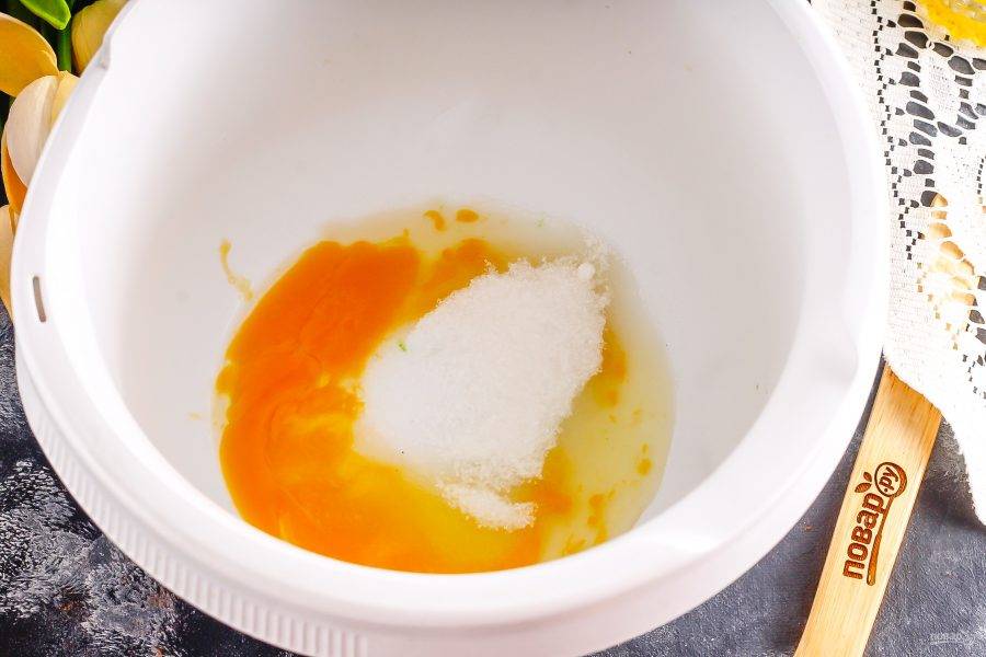 Добавьте цветочный мед и размешайте его в яичной массе.