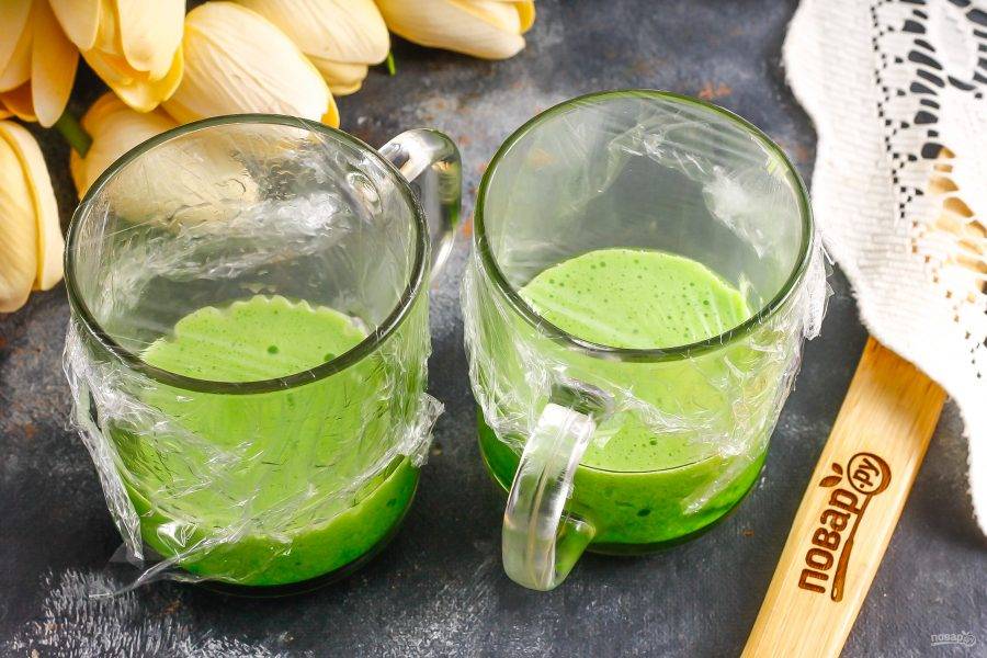 Смажьте чашки или стаканы из плотного стекла, керамики растительным маслом до верха. Выложите в них тесто на одну треть — бисквит очень сильно поднимается при выпекании!