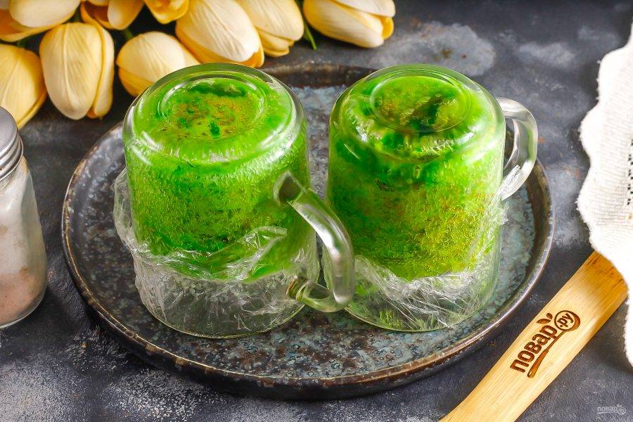Яркий зеленый мох на десертах — обычный бисквит, подкрашенный пищевым красителем. Его очень легко приготовить в микроволновке буквально за 10 минут. Главное — дать ему остыть.