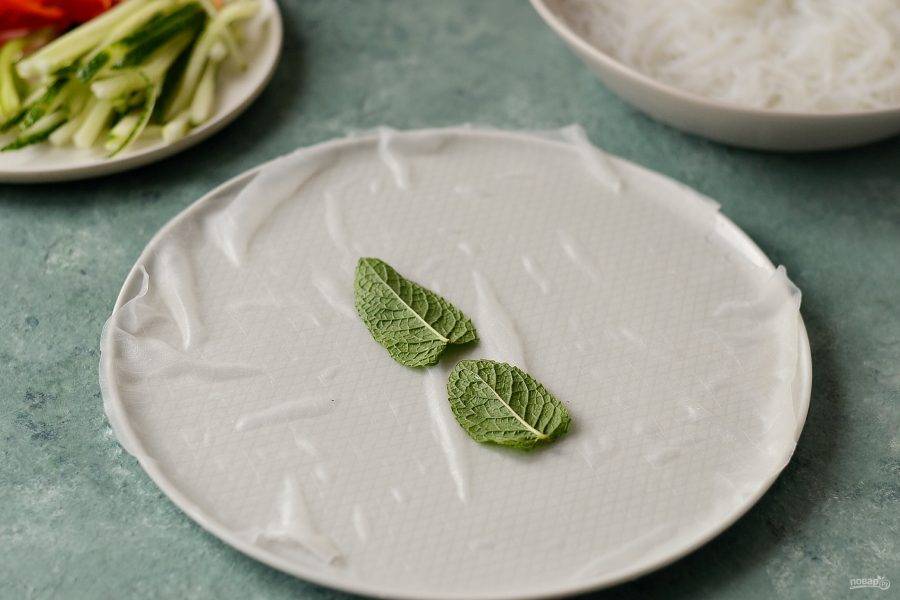 Размочите рисовую бумагу в холодной воде пару секунд. Переложите на рабочую поверхность. Выложите пару листиков мяты в центр.