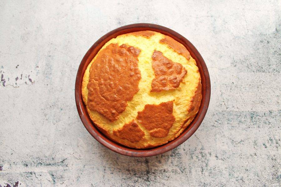 В белки добавьте щепотку соли и взбейте в пышную, устойчивую пену. Выложите взбитые белки в желтковую массу. Все аккуратно перемешайте сверху вниз.