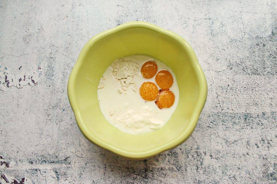 Разделите яйца на белки и желтки. Желтки выложите в миску, влейте молоко, добавьте сметану и муку, посолите. Все хорошо перемешайте до однородности.