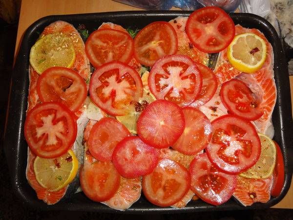 Помидоры моем и нарезаем колечками. Выкладываем на рыбу.