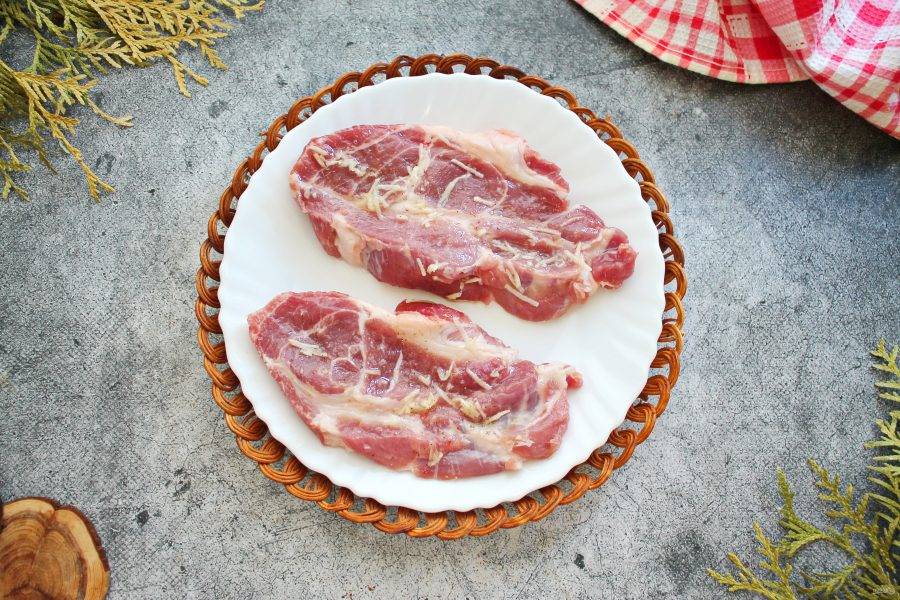 Свинину, я брала шею, разрежьте на четыре стейка, смажьте обе стороны растительным маслом, посолите и поперчите.