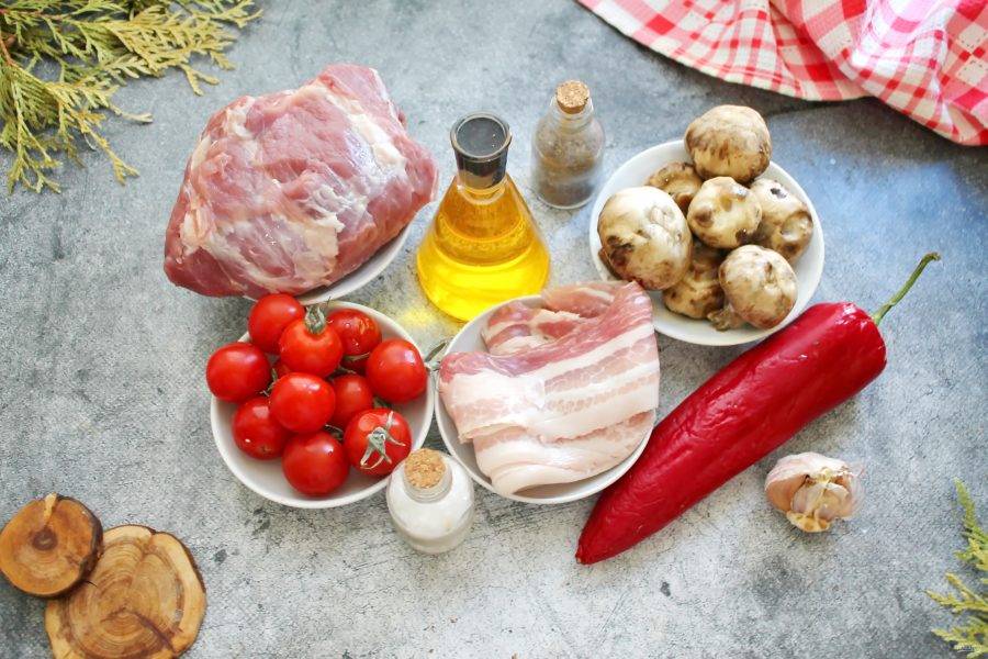 Подготовьте все необходимые ингредиенты для приготовления стейка из свинины в духовке в фольге. Овощи вымойте, свинину сполосните и обсушите.