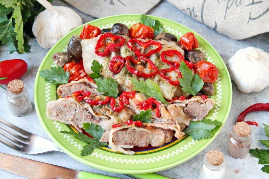 У болгарского перца срежьте плодоножку и удалите семена. Порежьте перец колечками или дольками и разложите поверх свинины. Овощи и грибы посолите, при желании посыпьте зеленью.