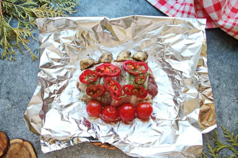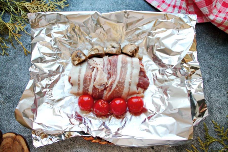 Каждый стейк обверните полосками бекона и выложите на фольгу для запекания.