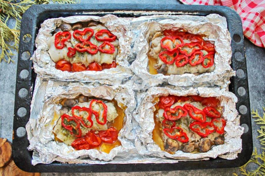 Заверните каждый стейк с овощами в фольгу и выложите на противень. Поставьте в горячую духовку и запекайте при температуре 180 градусов в течение 20-25 минут.
