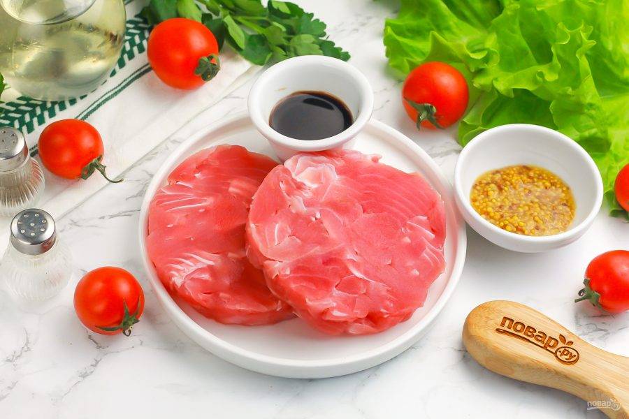 Подготовьте указанные продукты. Разморозьте стейки тунца, если приобретали их замороженными, и слегка отожмите. Если тунец свежий, то нарежьте его на стейки по 1,5-2 см. толщиной.