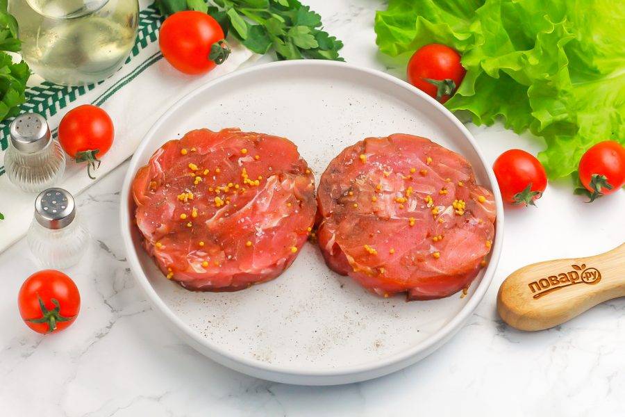 Посолите и поперчите стейки с обеих сторон, оставьте их на 10-20 минут для пропитки.