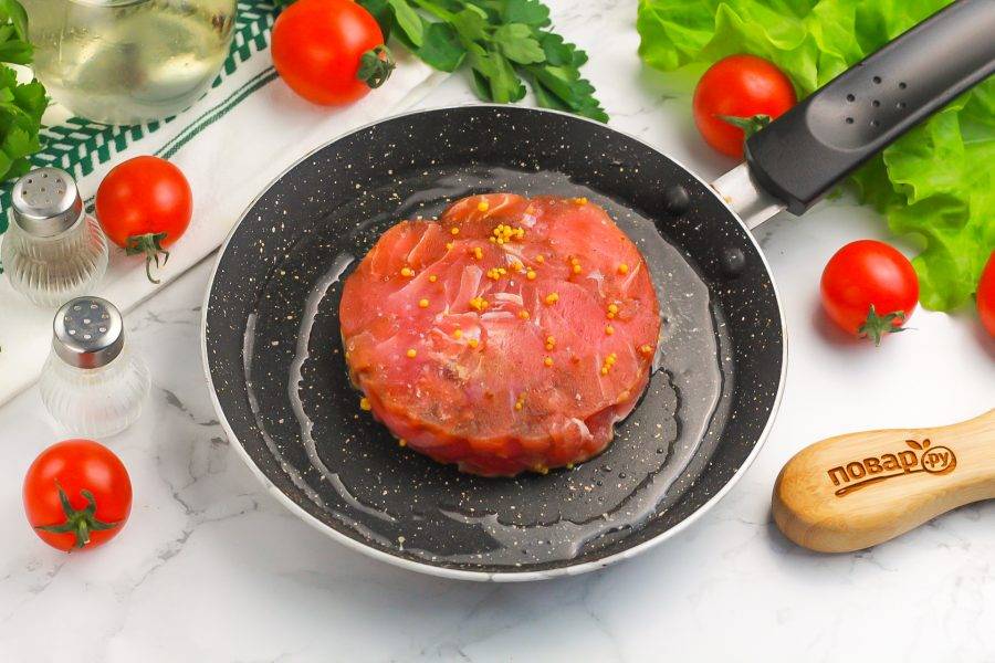 Разогрейте сковороду с растительным маслом и выложите на нее стейк. Обжарьте примерно 3 минуты.