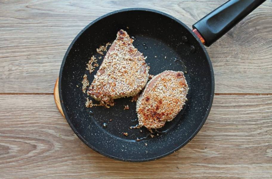 В тарелку насыпьте кунжут, выложите замаринованные стейки и полностью покройте их семенами.
