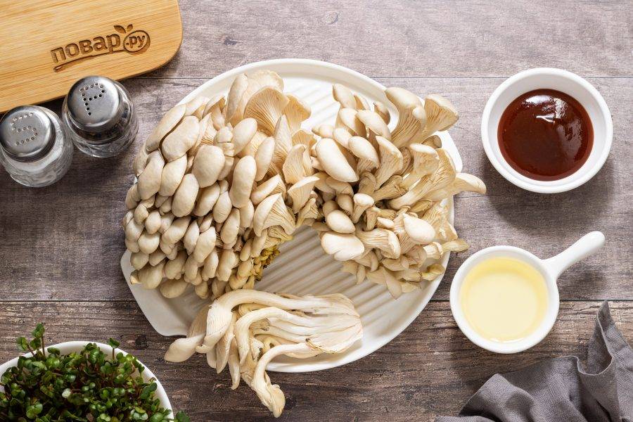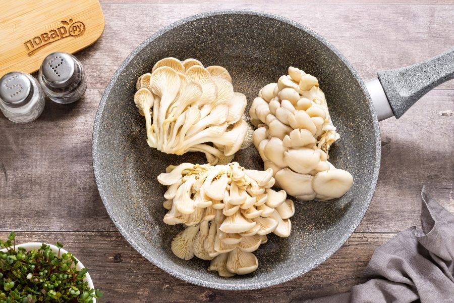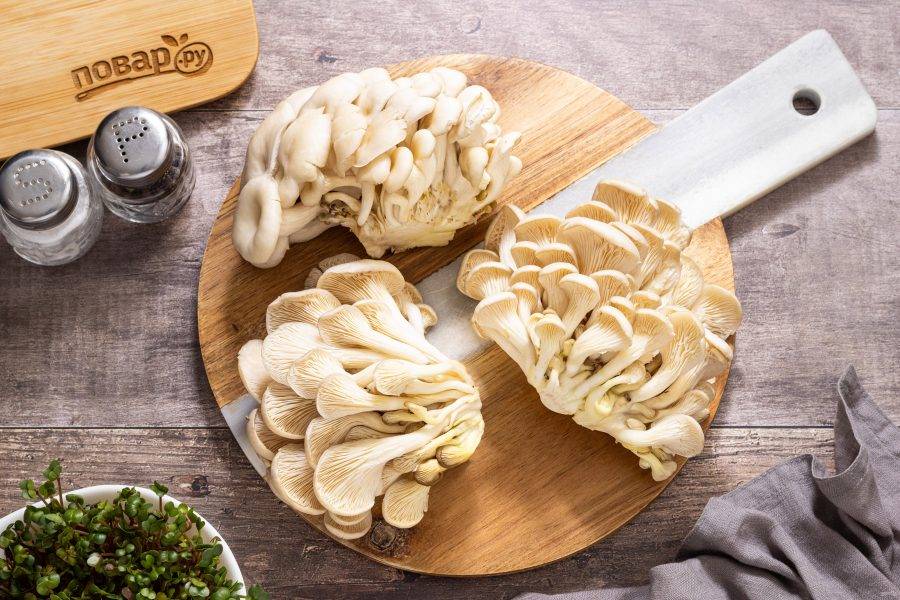 Вешенки слегка всполосните и обсушите. Разделите на крупные гроздья. Немного подрежьте плодоножку, но так, чтобы грибы все еще хорошо держались вместе.