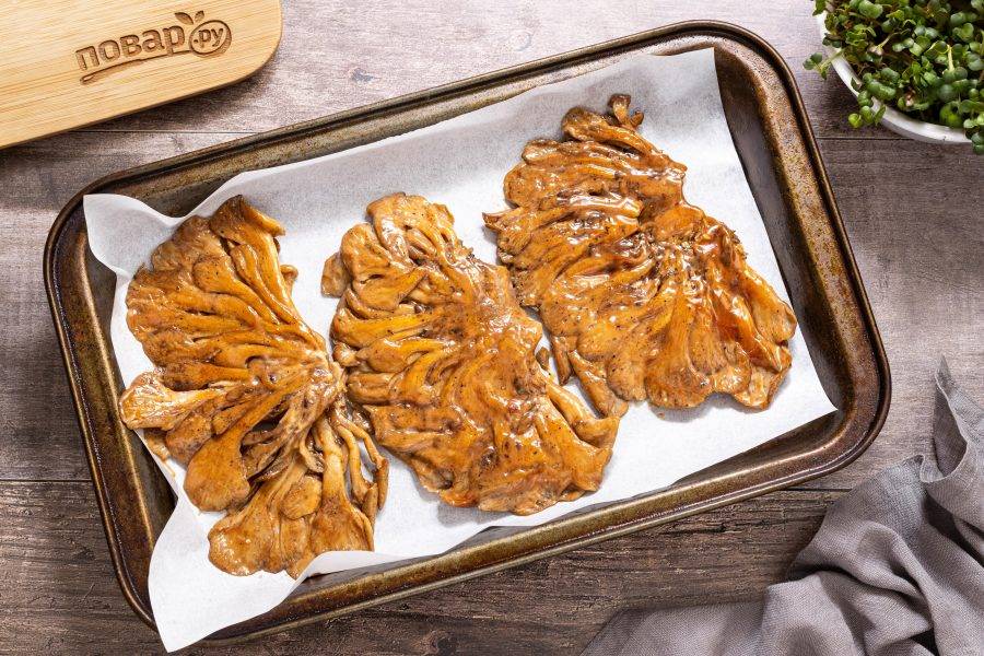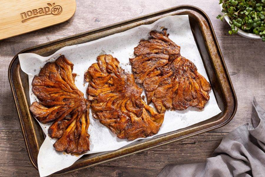 Выложите грибные стейки на противень застеленный пергаментов. Запеките в духовке 15-20 минут при температуре 190 градусов до румяного цвета.